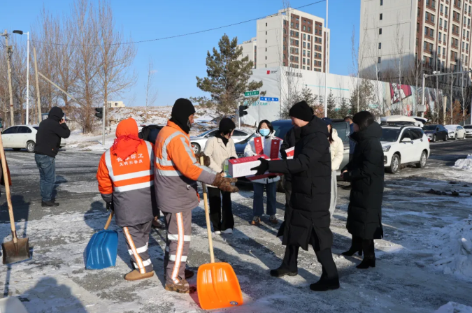 12月25日,度假区党工委副书记、总工会主席邱玉超带队,走到辖区内各主要干道,亲切慰问正在清理路面冰雪的环卫工人,询问大家工作情况和御寒措施,对他们的辛勤付出给予高度肯定和衷心感谢。随后,将保温水壶、红枣姜茶中药饮等暖心物资送到环卫工人手中,叮嘱大家在开展清雪作业的同时,也要注意自身防寒保暖。