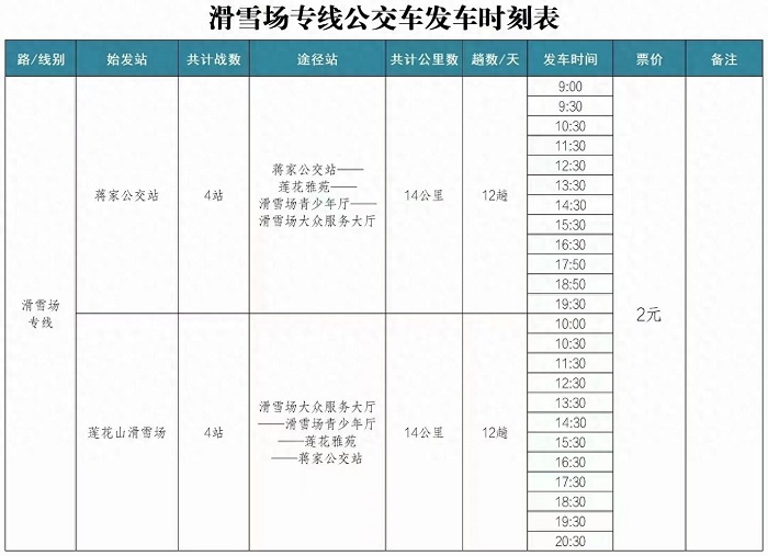 据介绍,蒋家公交站始发车为每日9时,莲花山滑雪场大众服务大厅始发车为每日10时,双向均为12趟/天。