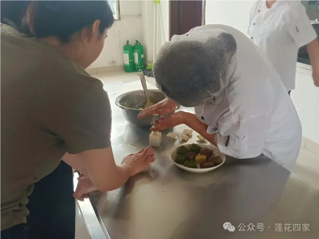活动现场,由老师示范讲解了如何制作绿豆糕和相关技巧。随后,大家在老师的指导下纷纷动手实践。