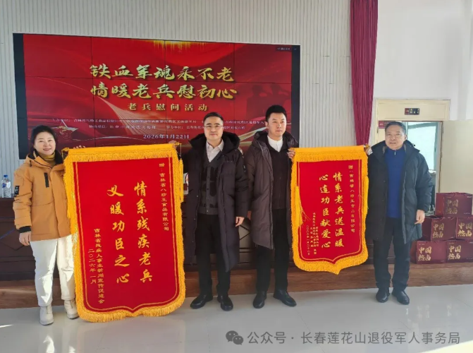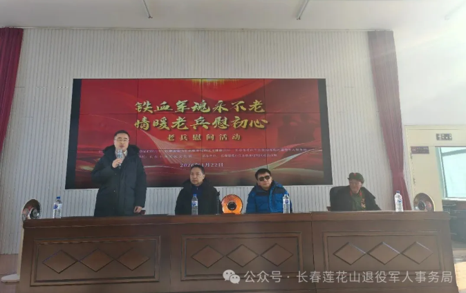 在新春佳节来临之际,1月22日上午,“铁血军魂永不老 情暖老兵慰初心”主题慰问活动在长春莲花山生态旅游度假区温情举办。本次活动由长春莲花山生态旅游度假区退役军人事务局、莲花山生态旅游度假区文体旅宣局、吉林省八珍王食品有限公司联合主办,南关区文化馆协办,劝农山镇人民政府承办。区退役军人事务局副局长徐百利、各相关单位代表、爱心企业人士、青年学员共50余人,与六位功勋卓著的老兵欢聚一堂,共叙情谊,传递祝福。