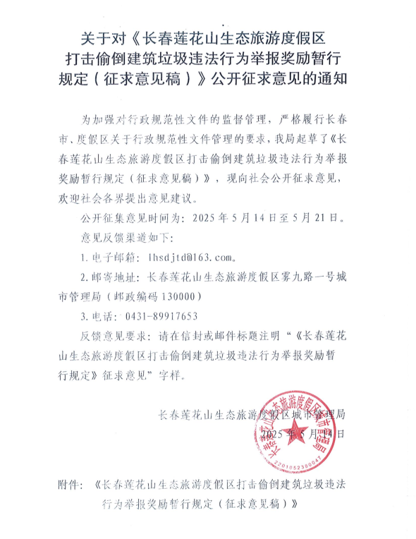关于对《长春莲花山生态旅游度假区打击偷倒建筑垃圾违法行为举报奖励暂定规定(征求意见稿)》公开征求意见的通知
