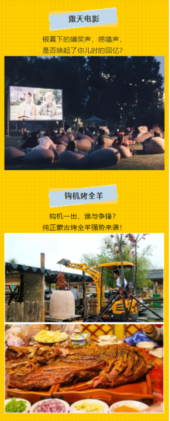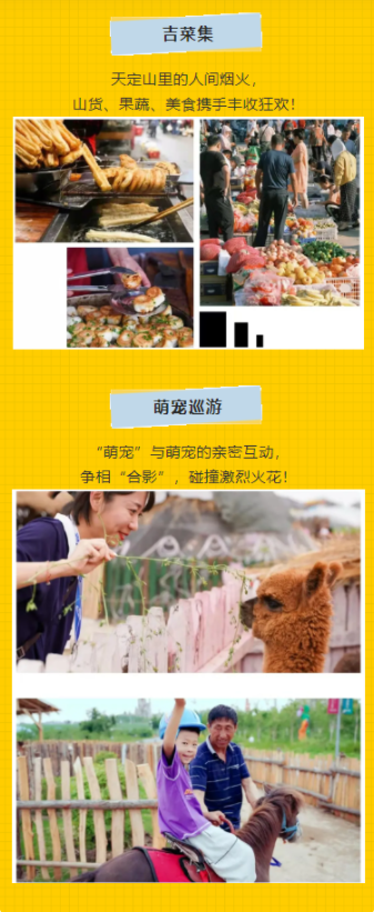 丰收文化节期间,天定山全域30余项旅游业态全面开放——山货集市、美食街区、跳蚤市场、亲子乐园、萌宠合影、人偶巡游、红包抽奖、捕鱼仪式、钩机烤羊、篝火晚会、野战之王、露天电影。
